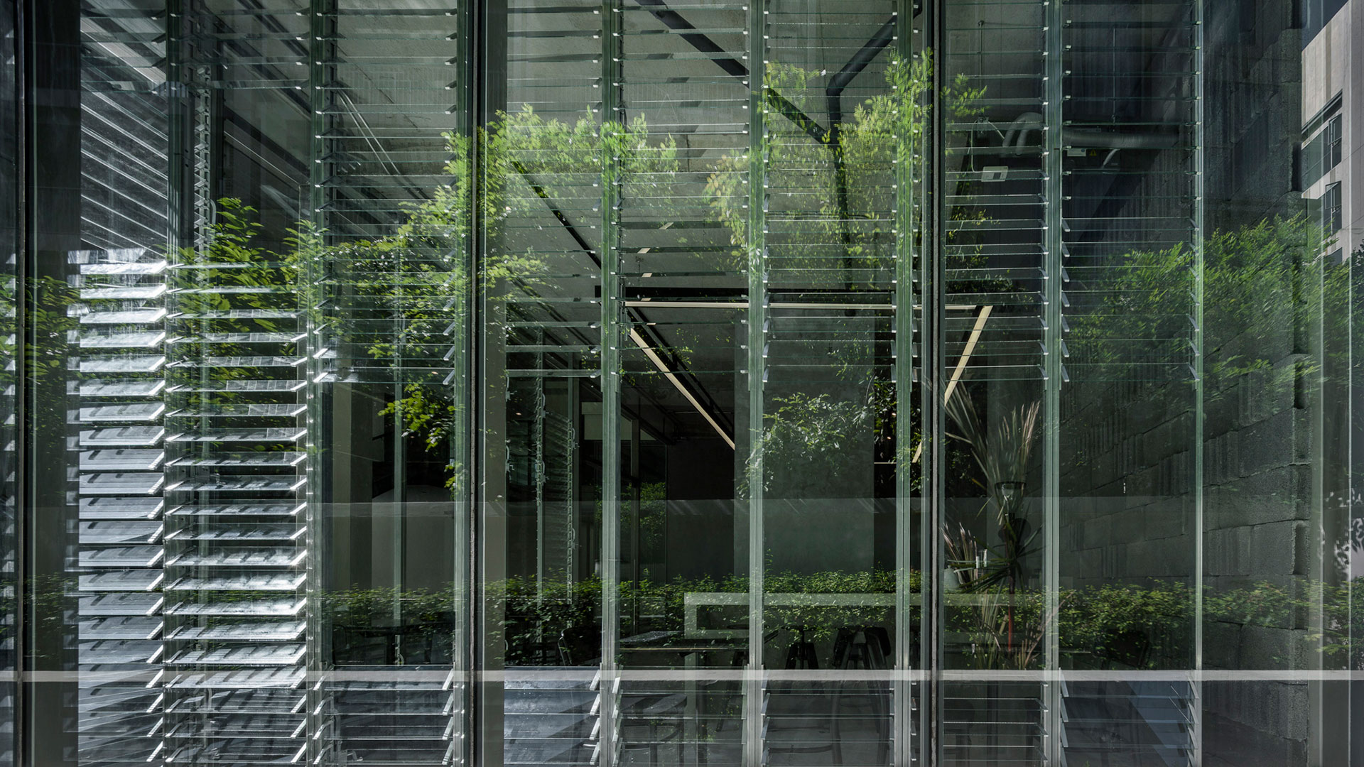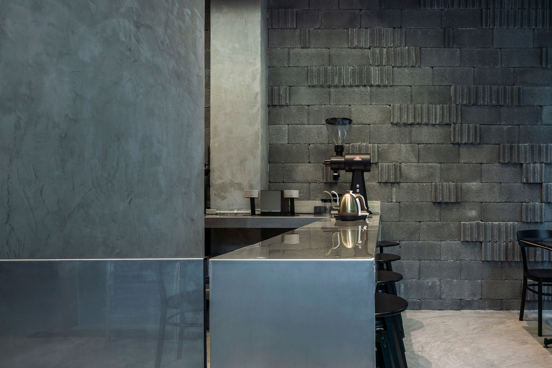 Bare ‘concrete blocks’, without any plastered, are arrayed in simple arrangement, together with randomly inserting another edge of concrete block to generate an interesting pattern to a large back wall. Floor and ceiling are left over as it looks like before, which is ‘polished cement’ and ‘reinforced concrete’ without any finished material. Counter bar is cladded by ‘stainless steel’ plate which emphasizing coffee elements on the counter. An ‘adjustable glass louver’ is formed to duplicate layer of a front glass wall in order to change the façade feature. It has been transformed from a horizontal wooden louver wall in an old roasting house, while allows people seeing activities inside from its transparency.