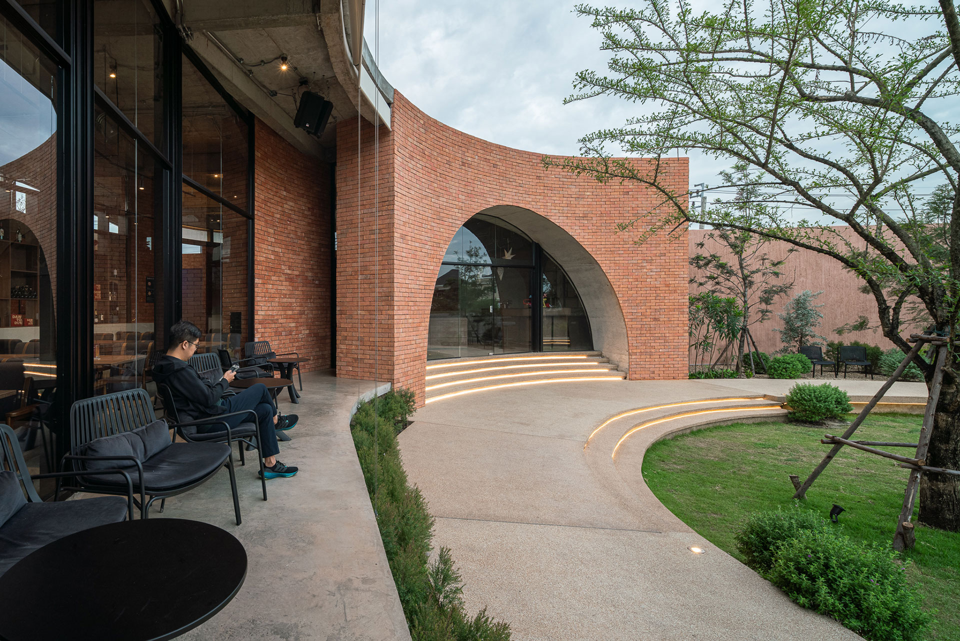 Aged brick serves as the primary material for the exterior wall, as its durability and its color exceptionally complement the orange-hued sky during sunrise and sunset, conveying the ambiance of a cross-cultural restaurant with a touch of elegance. The pattern of an exterior brick is continuously applied to the interior space, mixing with other good vibes materials and decorations to create a mood suitable for various types of food, offering cross-cultural comfort. Each indoor space provides a view of the New Moon outdoor area through a semi-circle arch shape, symbolizing the sun.