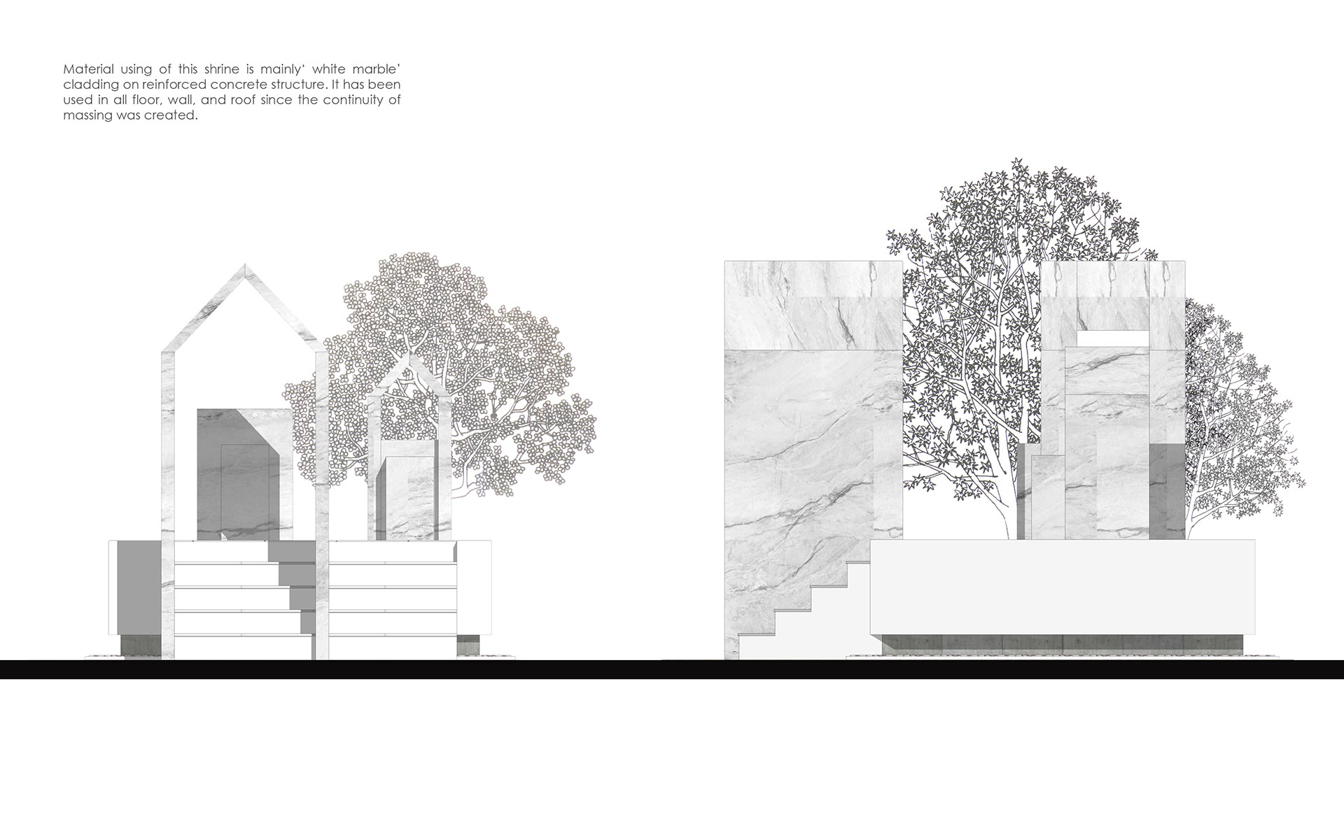 The architecture has 3 gables, big one, medium one, and small one which is for MAIN ENTRANCE, BRAHMA, and GUARDIAN SPIRIT respectively. Floor level has been elevated for 1 meter because the shrine should be placed on higher level than the house. It is located in a large green space in between each buildings which can easily access and worship. Moreover, Brahma has 4 faces, in our belief, 4 faces can see things and protect us in 360 degrees.